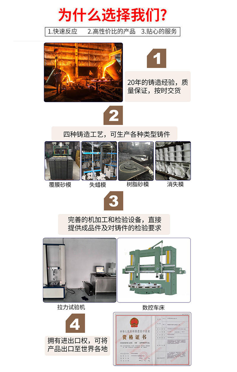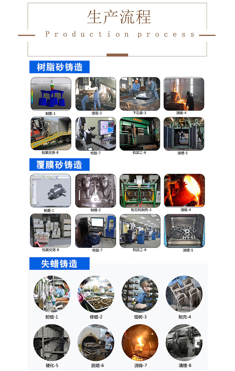 生產(chǎn)設(shè)備:樹(shù)脂砂鑄造、覆膜砂鑄造、失蠟鑄造、中頻電爐、爐前分析儀、退火爐等。